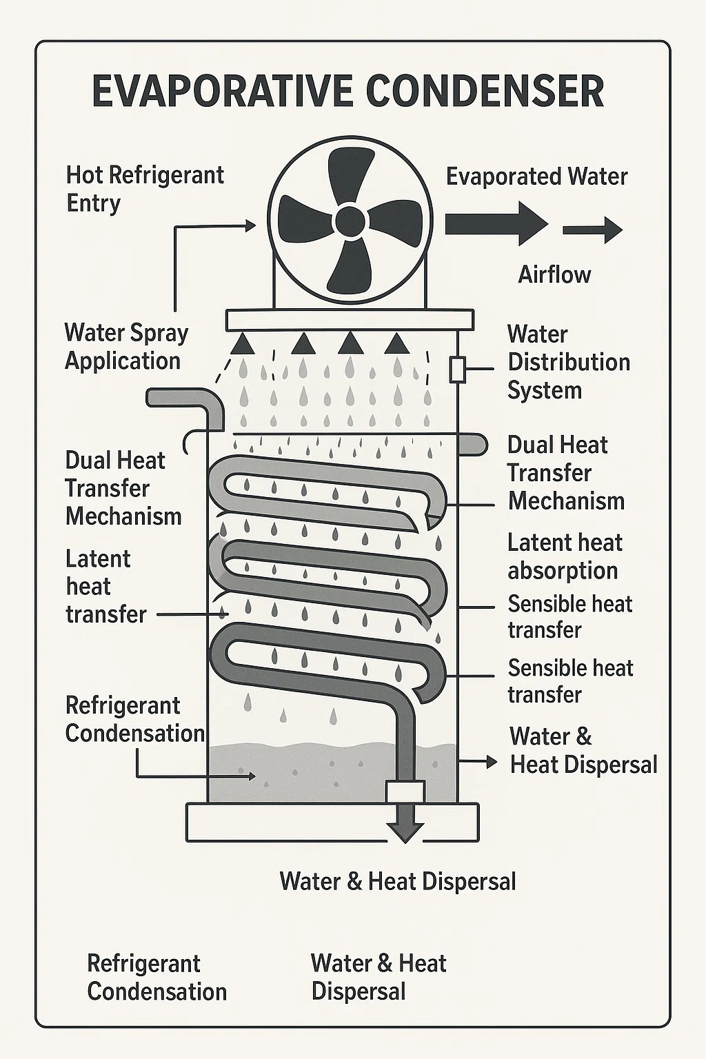 I condensatori evaporativi respingono il calore combinando il raffreddamento dell'aria con l'evaporazione dell'acqua. A differenza dei condensatori standard che si basano esclusivamente sul trasferimento di calore sensibile, sfruttano l'assorbimento del calore latente durante l'evaporazione dell'acqua.